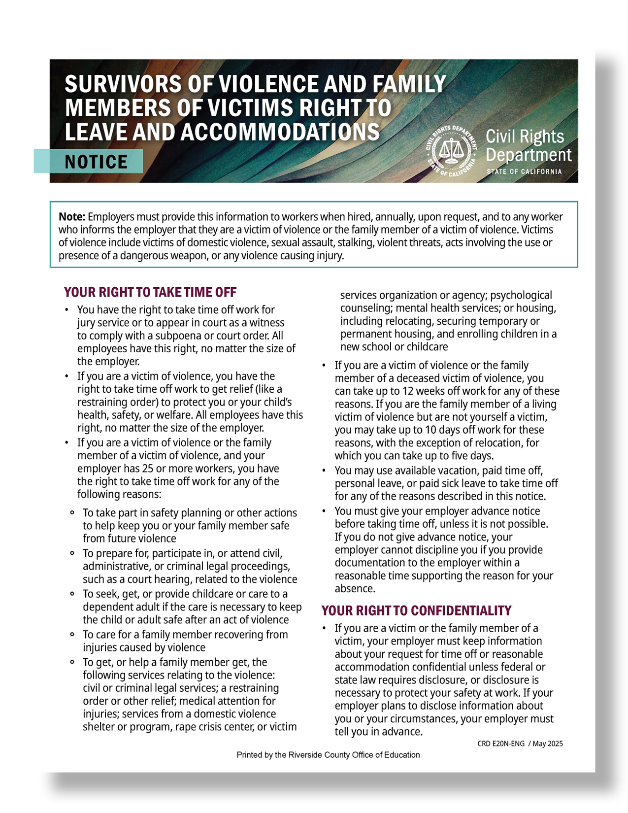 Survivors of Violence and Family Members of Victims Right to Leave and Accommodations flyer provides information from the State of California Civil Rights Department.