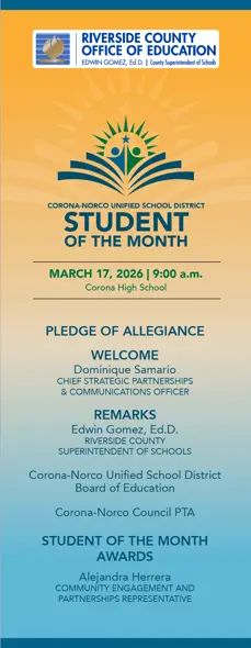 Organized by the Riverside County Office of Education, the Corona-Norco Unified School District Student of the Month event honors high school seniors from the Corona-Norco Unified School District.