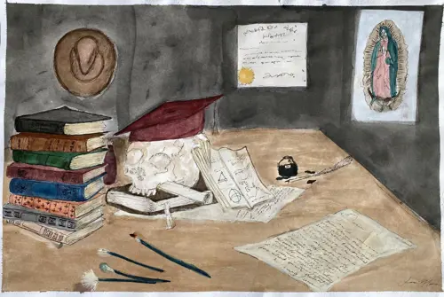 Artist Statement: This artwork was inspired by Paul Cezanne’s French paining, Still Life With Skull. It is comparing life to education. You work your way up to a degree to be able to obtain a well-paying job, live your life a little, then death hits. The story is a quite morbid but if you think about it, what's next?
