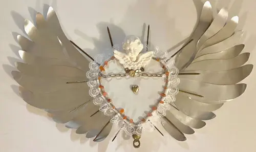 Artist Statement: Inspired by the love sanctuaries popular in Mexican-American communities, 'Sanctuary of Self Love' is in honor of human vulnerability. The nails and sharp items that compose this piece are meant to symbolize the pain that comes with being vulnerable. In contrast, the light color palette, lace, and use of white, is meant to contrast the pain and show the beauty and innocence of human emotions.