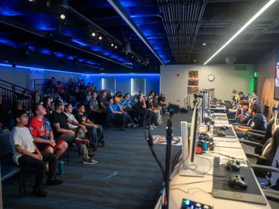 The Arena and associated rooms feature more than 4,000 square feet that can accommodate nearly 400 guests for competitions. The flexible design includes retractable bleachers, customizable LED screens and lighting, and simulcast capabilities for overflow spectators. When configured for esports competitions, up to 12 players can play simultaneously. With a simple set-up change, the space can be used for small conferences of 100-150 attendees.