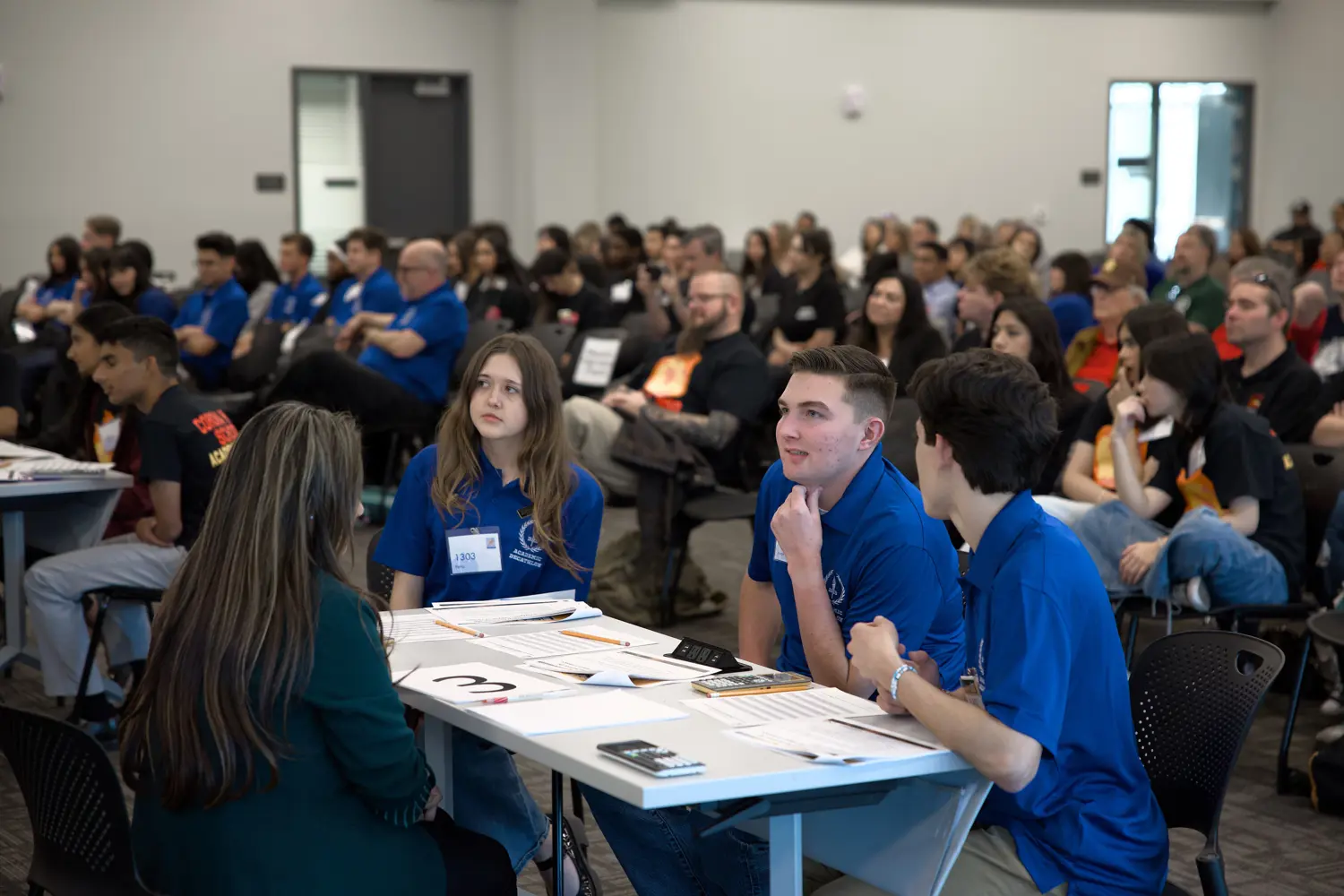Academic Decathlon, like its ancient Greek counterpart, is a 10-event contest. Participants demonstrate their academic strength by completing seven written tests, writing an essay, delivering a prepared and an impromptu speech, and participating in an interview. The Super Quiz is a team event held before a live audience. Each team is composed of nine students, three from each grade point category, and includes three Honor (GPA 3.80 - 4.00), three Scholastic (GPA 3.20 - 3.799), and three Varsity (GPA 0.00 - 3.199) students.