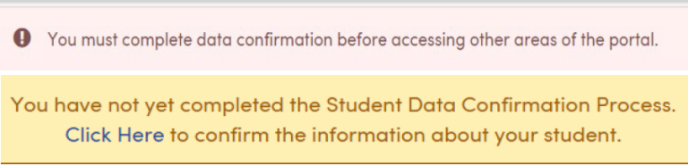 - Once you have access to your account you should see the pink or yellow box listed below. It will be located at the top of your screen. Click on “click here” to begin your registration.